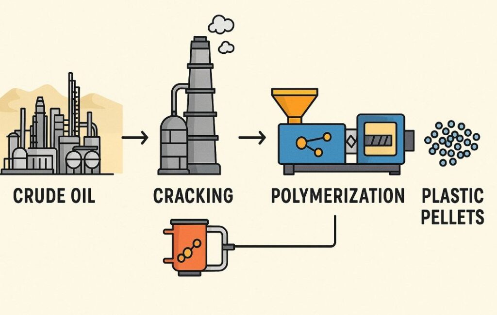 Minyak mentah diambil dari dalam bumi → disuling → menghasilkan bahan seperti naptha → lalu diproses lagi jadi ethylene & propylene → baru deh jadi biji plastik (resin).